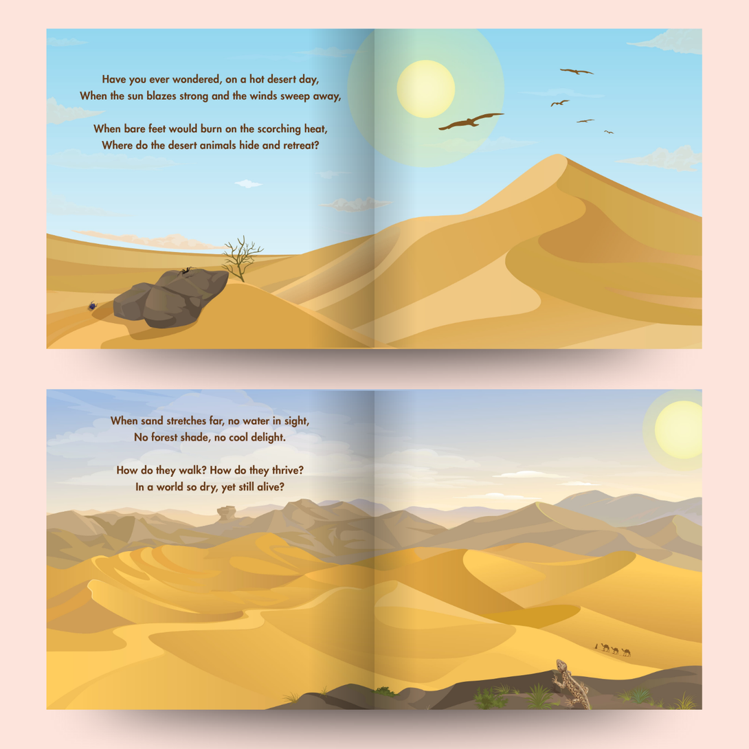 In the Desert takes children on a fascinating journey across golden dunes, introducing them to the animals that call the desert home—from camels and foxes to beetles, tortoises, and gazelles. With engaging rhymes and vibrant illustrations, the book shows how each creature has unique features and ways of surviving in one of the harshest environments on earth. Perfect for curious young readers, it blends fun facts with storytelling to spark wonder about nature’s resilience and the beauty of life in the desert.