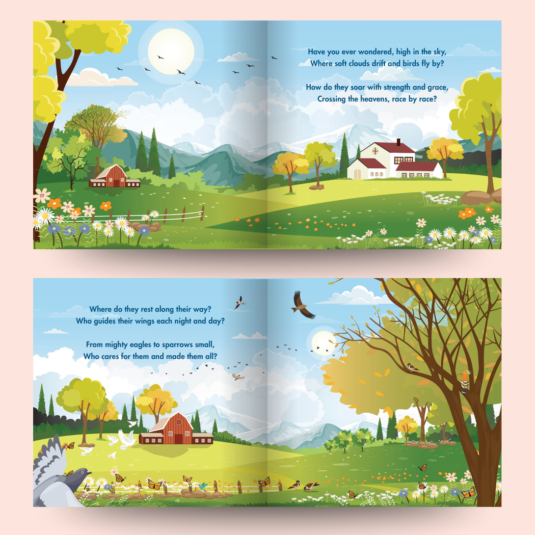 In the Sky invites children to look up and explore the wonders above—soaring eagles, tiny sparrows, gentle doves, colorful parrots, wise owls, playful bats, butterflies, and flocks of geese finding their way home. Told in lyrical rhymes with vibrant illustrations, the story shows how every bird, wing, and breeze is part of the Creator’s design and care. With gentle reminders of trust, gratitude, and wonder, this book encourages children to pause, observe, and whisper thanks for the beauty and protection that surrounds them in the skies.